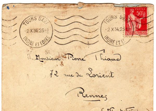 Lettre du 2 octobre 1934 oblitération mécanique type Krag ligne continue "Tours gare pour Rennes" Affranchissement un timbre Paix N° Yvert 283 avec faciale égale à 50c correspondant au tarif intérieur de la lettre du 6 avril 1932 au 11 juillet 1937