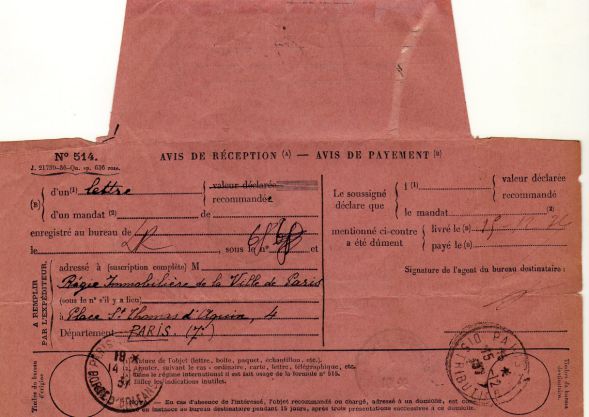 Verso Avis de réception oblitéré le 15 décembre 1937 « PARIS DISTRIBUTION »
