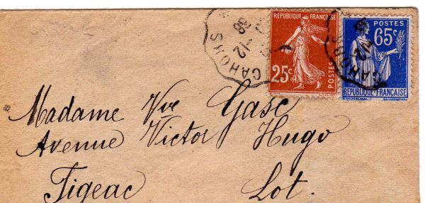 Lettre type mignonnette avec cachet convoyeur "Cahors à Figeac" du 31-12-1938 L'affranchissement est composé d'un timbre type Paix N°365 (65 c outre-mer) et d'un timbre type semeuse N° 235 (25c jaune-brun) Total 90ctarif intèrieur de la lettre du 17 novembre 1938 au 30 novembre 1939