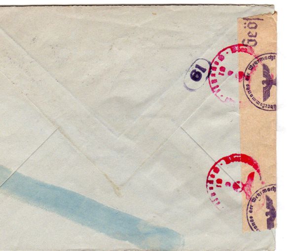 VERSO La lettre comporte l’autre côte la bande de contrôle type allemand et deux cachets manuels allemands de couleur rouge de type G3 « GEPRÜFT XI » de l’ABP de BERLIN utilisés d’août 1940 à décembre 1943 De ce côté aussi recherche de texte à l’encre sympathique