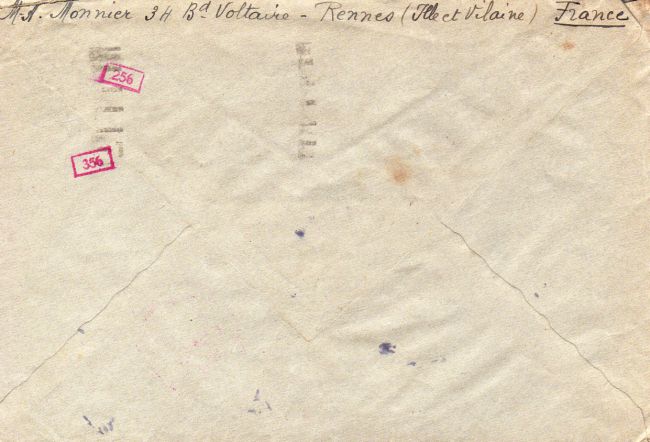 Verso le l'enveloppe de la lettre du 10 juin 1944 Comporte deux numéros de contrôle N° 256 et 356