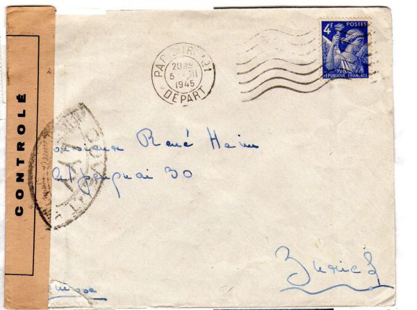 Lettre du 5-3-1945 Cachet de contrôle « Ouvert par l’autorité militaire LLY »
